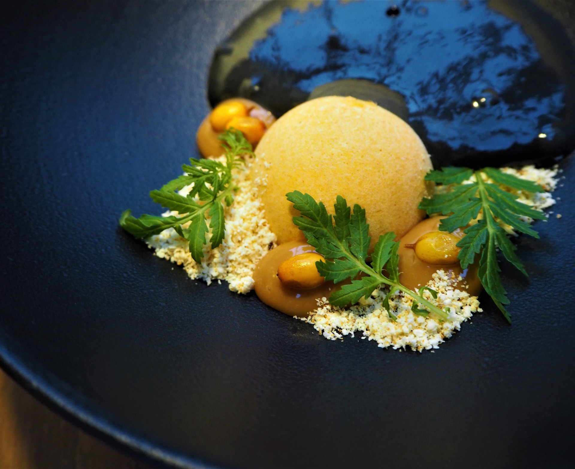 Lopuksi lasiin rakentuu jälkiruoka, jossa mustikka ja timjami kietoutuvat kermaiseen täytteeseen ja paahdettuun kauramuruun – kuin metsäretken viimeinen makumuisto.